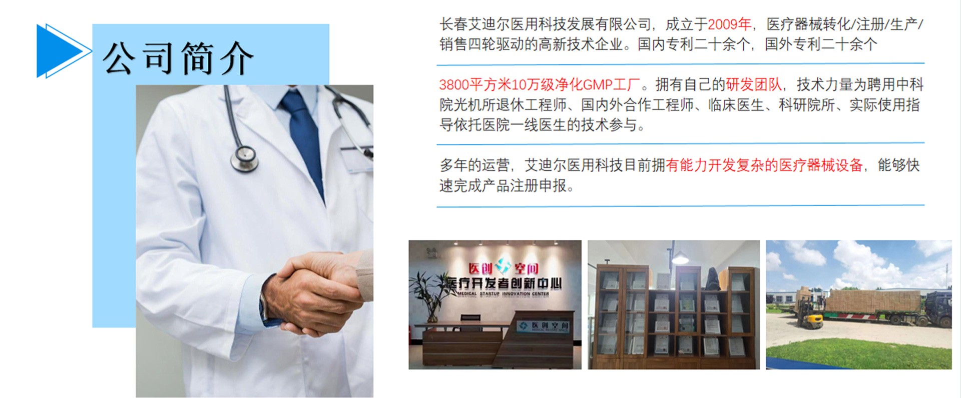 長春艾迪爾醫(yī)用科技發(fā)展有限公司為集產(chǎn)(自有工廠); 學(xué)(多所院校科研課題合作單位);研(研發(fā)成果轉(zhuǎn)化注冊)三位一體的高新技術(shù)企業(yè)。艾迪爾科技主要經(jīng)營范圍為一次性醫(yī)療器械耗材的開發(fā),專注于抗菌肽新材料的開發(fā)和研制,以“IN-58抗菌肽一類新藥及原料藥注冊、激光類治療儀”兩個核心優(yōu)勢技術(shù)為中心。公司擁有標(biāo)準(zhǔn)GMP車間及健全的質(zhì)量管理體系,擁有多個已上市和即將上市的產(chǎn)品,包括睡眠、泌尿、口腔、肝膽、消殺、婦科六大系列產(chǎn)品線。公司擁有核心專業(yè)技術(shù)報批團隊,承接國內(nèi)外醫(yī)療器械專項成果轉(zhuǎn)化,具備自主研發(fā)能力及MAH服務(wù)能力。